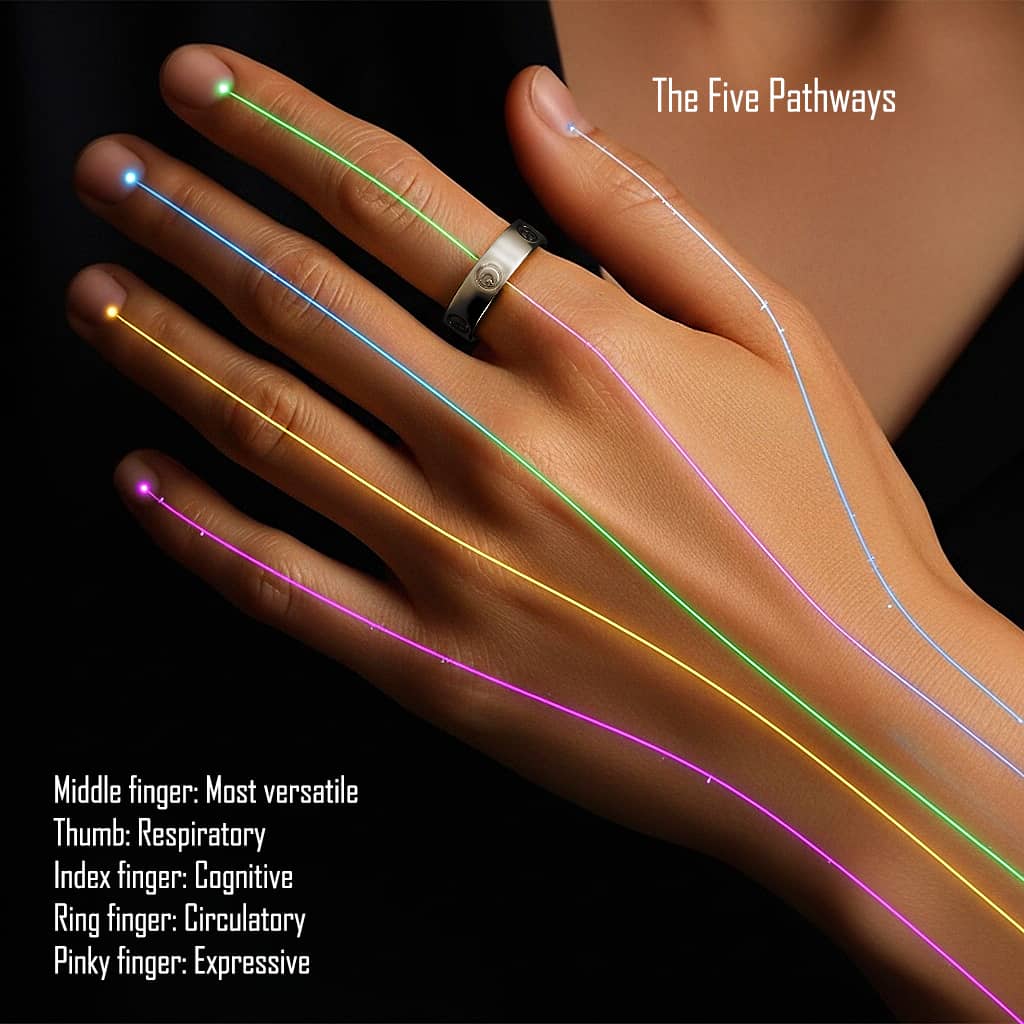 Each fingertip is where an energy pathway terminates. These meridians connect to specific organ systems: respiratory, digestive, cardiovascular, circulatory, emotional processing, gut-brain communication.
